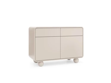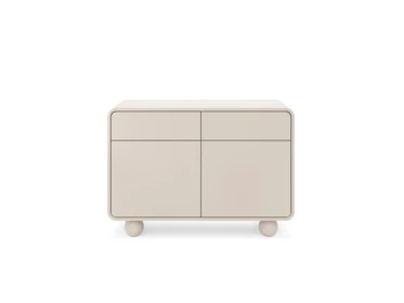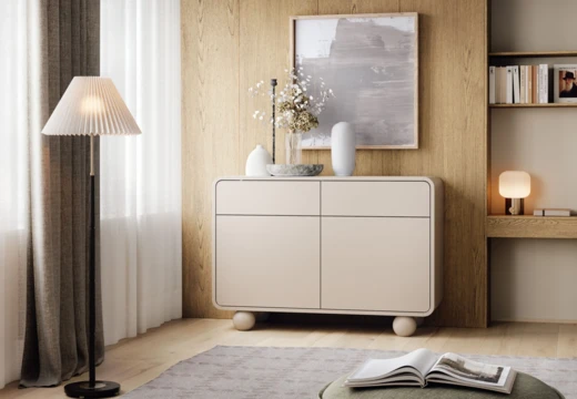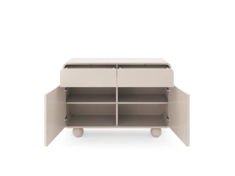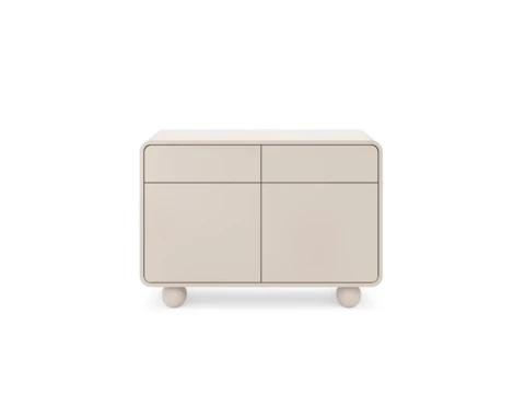 Wyjątkowy charakter mebla nadają zaokrąglone rogi i pomysłowe okrągłe nogi.