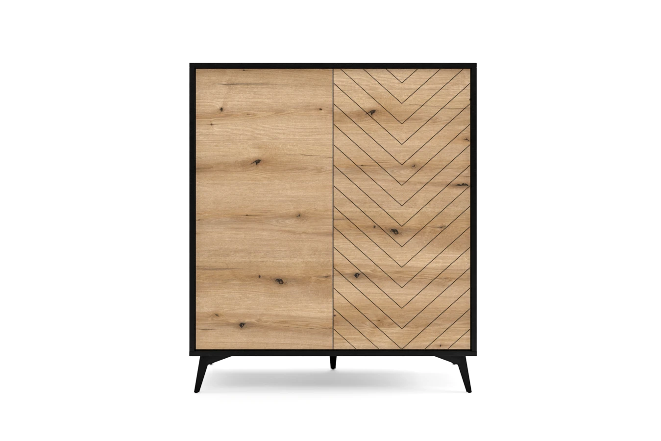 Nowoczesna komoda Diamond została wykonana z wysokiej jakości płyty laminowanej w eleganckim połączeniu czerni i dekoru dąb evoke, dzięki czemu doskonale pasuje do nowoczesnych wnętrz. Materiał jest trwały i łatwy w pielęgnacji, a krawędzie zabezpieczone listwami ABS zwiększają odporność na uszkodzenia.