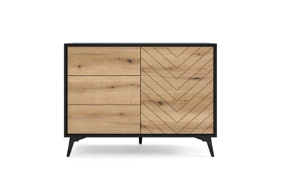 Nowoczesna komoda Diamond została wykonana z wysokiej jakości płyty laminowanej w eleganckim połączeniu czerni i dekoru dąb evoke, dzięki czemu doskonale wpisuje się w aktualne trendy wnętrzarskie. Materiał jest trwały i łatwy w codziennej pielęgnacji, a krawędzie zabezpieczone listwami ABS zwiększają odporność na uszkodzenia.