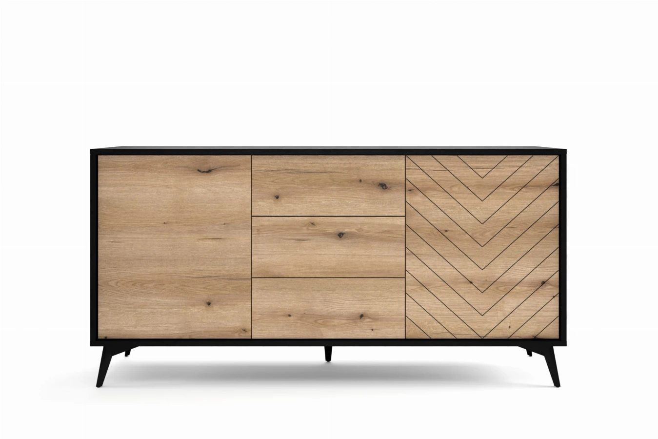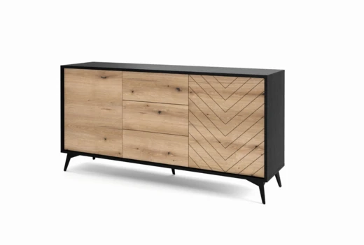 Zastosowany system dotykowego otwierania push-to-open zastępuje klasyczne uchwyty i podkreśla minimalistyczny design mebla. Komoda oferuje funkcjonalną przestrzeń do przechowywania – posiada trzy szuflady, dwoje drzwiczek oraz wewnętrzne półki, które ułatwiają organizację rzeczy w salonie. Całość osadzona jest na wysokich metalowych nogach w czarnym kolorze, dodających lekkości i nowoczesnego stylu.