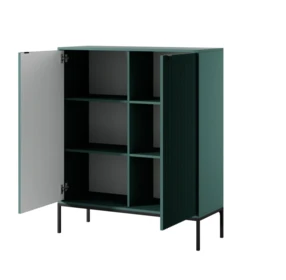 Posiada dwoje drzwi, dwie półki i dwie szuflady.