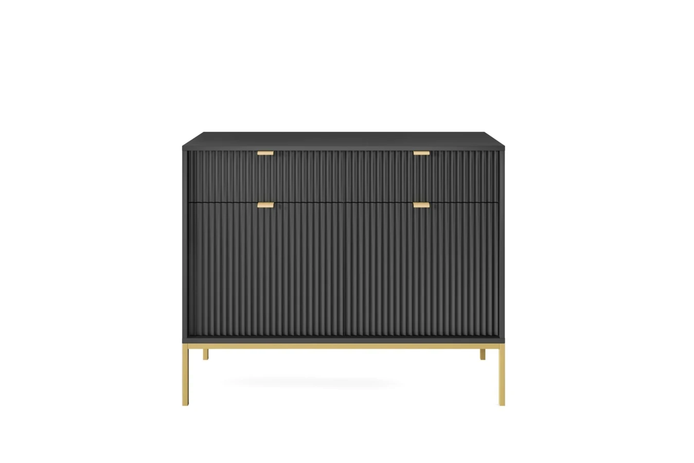 Posiada dwoje drzwi, dwie półki i dwie szuflady.