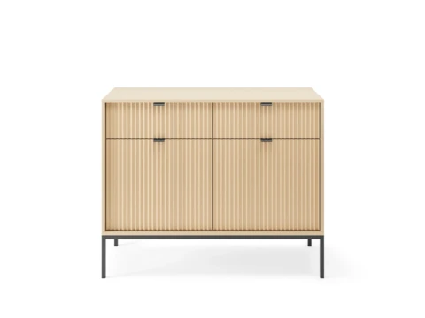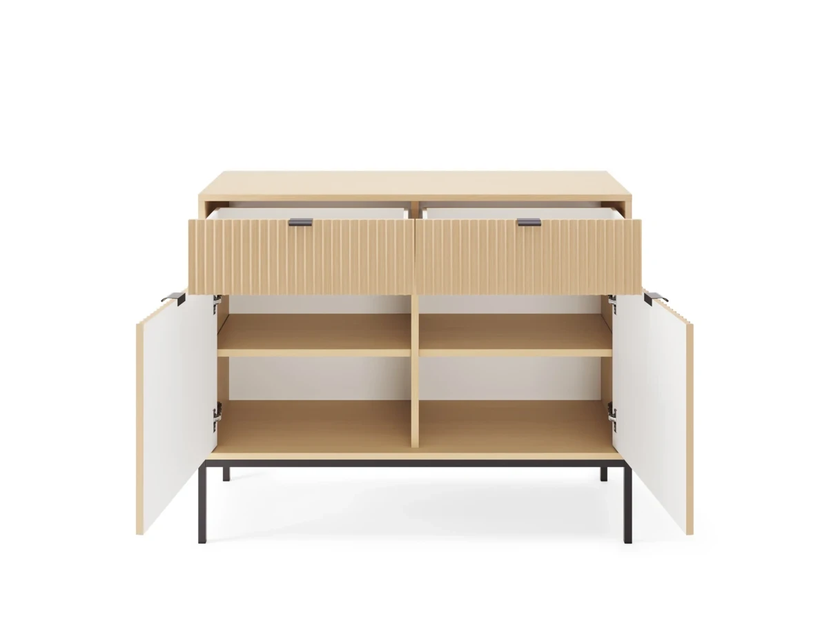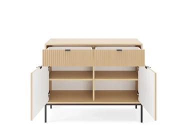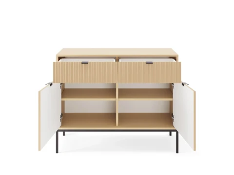 Posiada dwoje drzwi, dwie półki i dwie szuflady.
