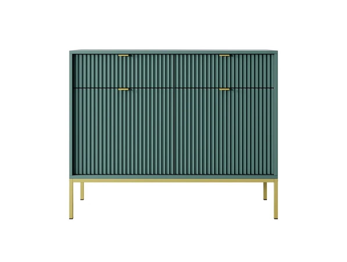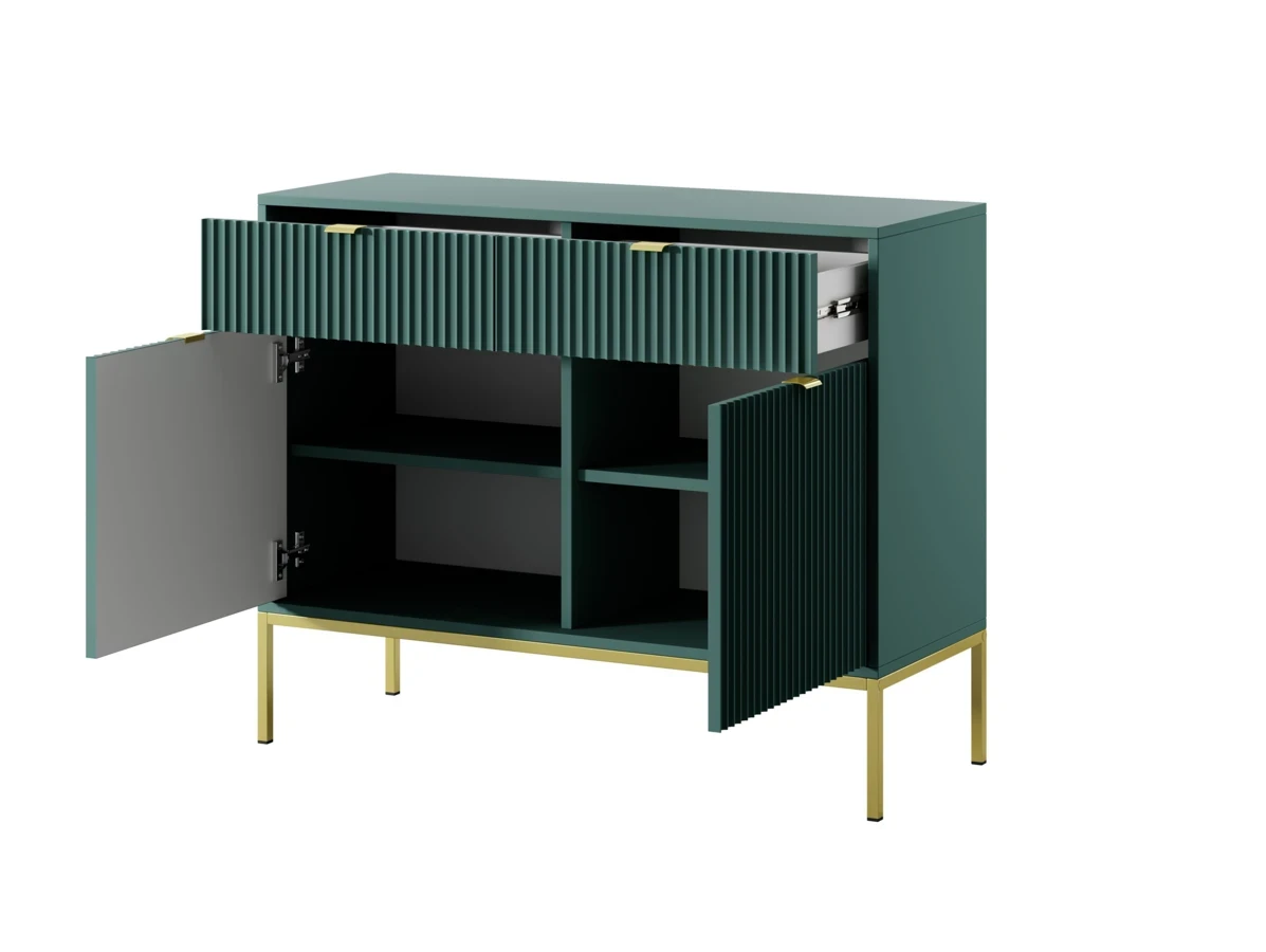 Posiada dwoje drzwi, dwie półki i dwie szuflady.