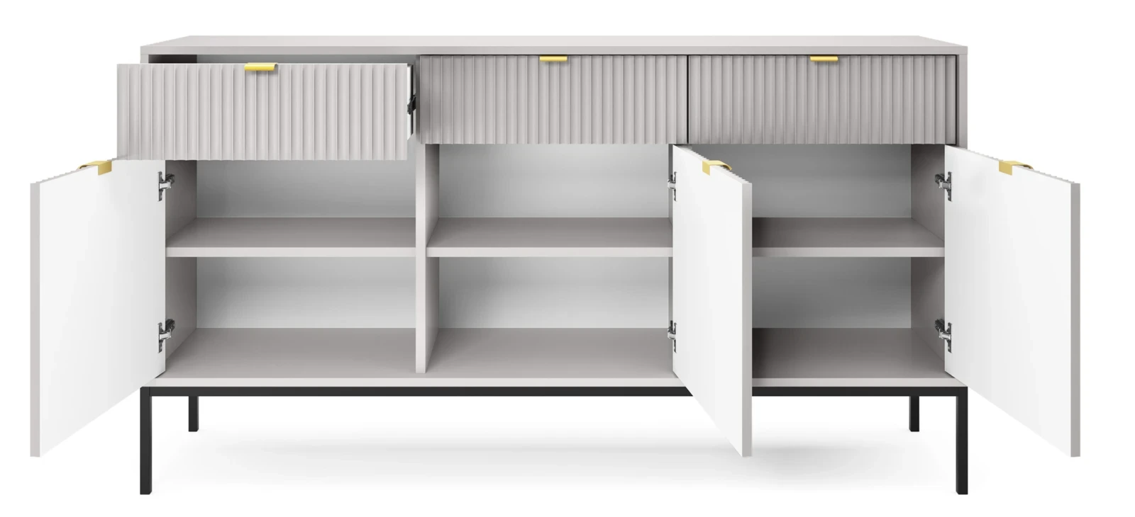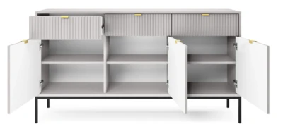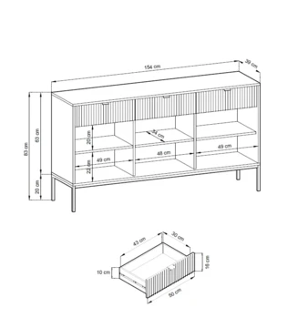 Posiada dwoje drzwi, dwie półki i dwie szuflady.
