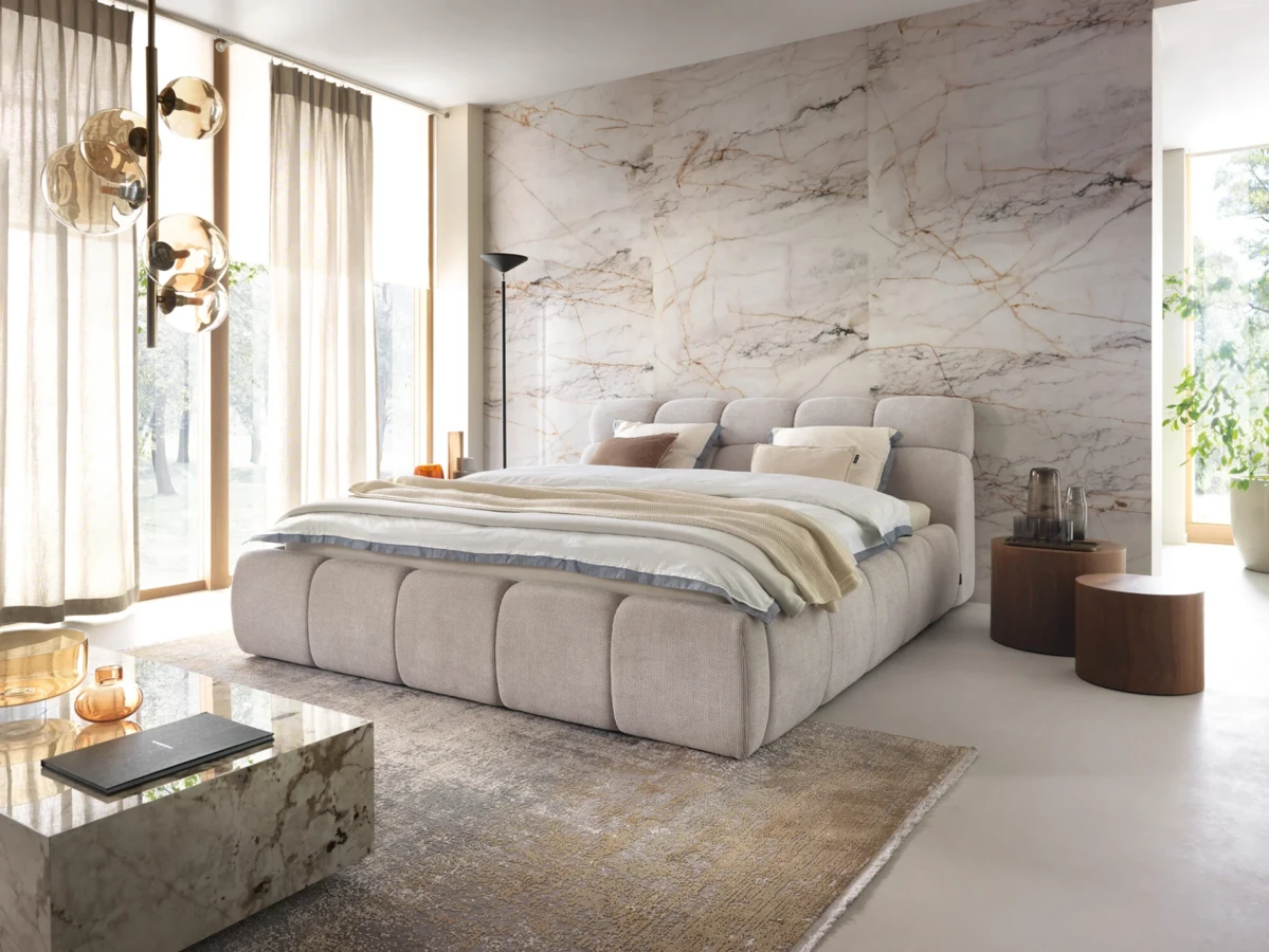 Zarówno wezgłowie, jak i boki łóżka zdobi eleganckie pikowanie, podkreślające miękkie, zaokrąglone kształty.