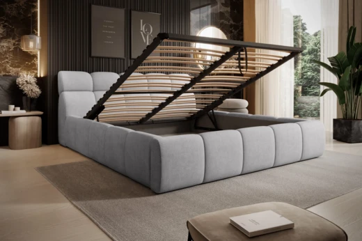W zestawie znajduje się podnoszony stelaż z metalową ramą i siłownikami gazowymi, pod którym ukryty jest praktyczny pojemnik na pościel.