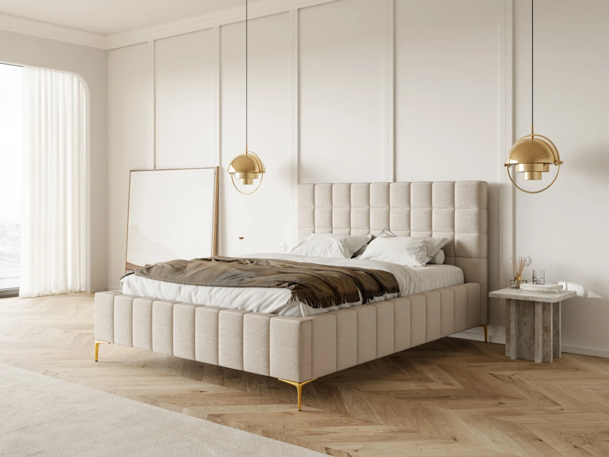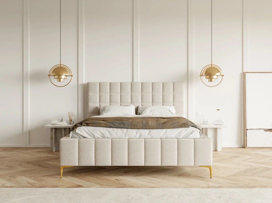 Kratkowe przeszycia tapicerowanego zagłówka dodają łóżku subtelnego i eleganckiego detalu.