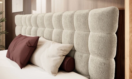 Rama łóżka oraz zagłówek są tapicerowane, a jako wypełnienie zastosowano trwałą piankę PUR.