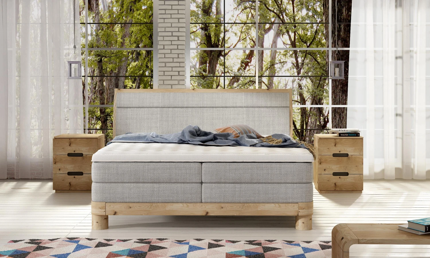 Łóżko kontynentalne tapicerowane z litego drewna z materacem.