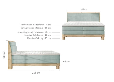 Dolna warstwa wykonana jest z litego drewna dębowego i mieści materac ze sprężynami bonellowymi.