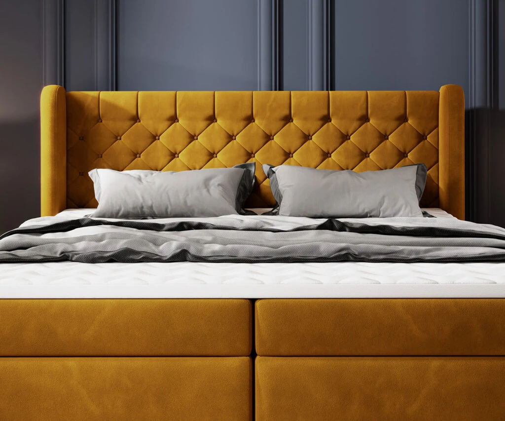 Tapicerowane łóżko kontynentalne 160x200 z praktyczną, wysoką powierzchnią spania,