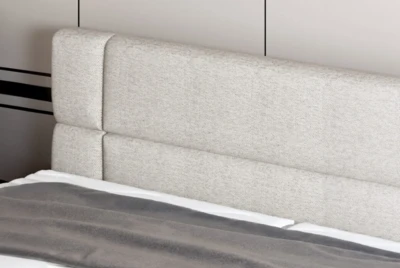 Eleganckie wezgłowie łóżka ozdobione jest grubym, podwójnym pikowaniem.