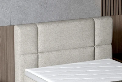 Eleganckie wezgłowie łóżka ozdobione jest grubym, podwójnym pikowaniem.