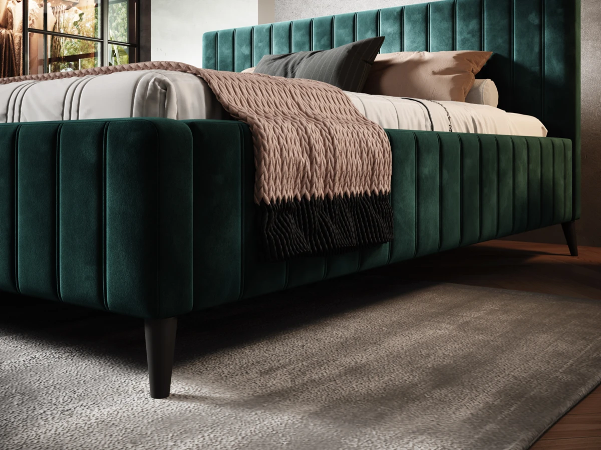 Rama łóżka oraz zagłówek są tapicerowane, a do wypełnienia użyto wysokiej jakości pianki PUR.