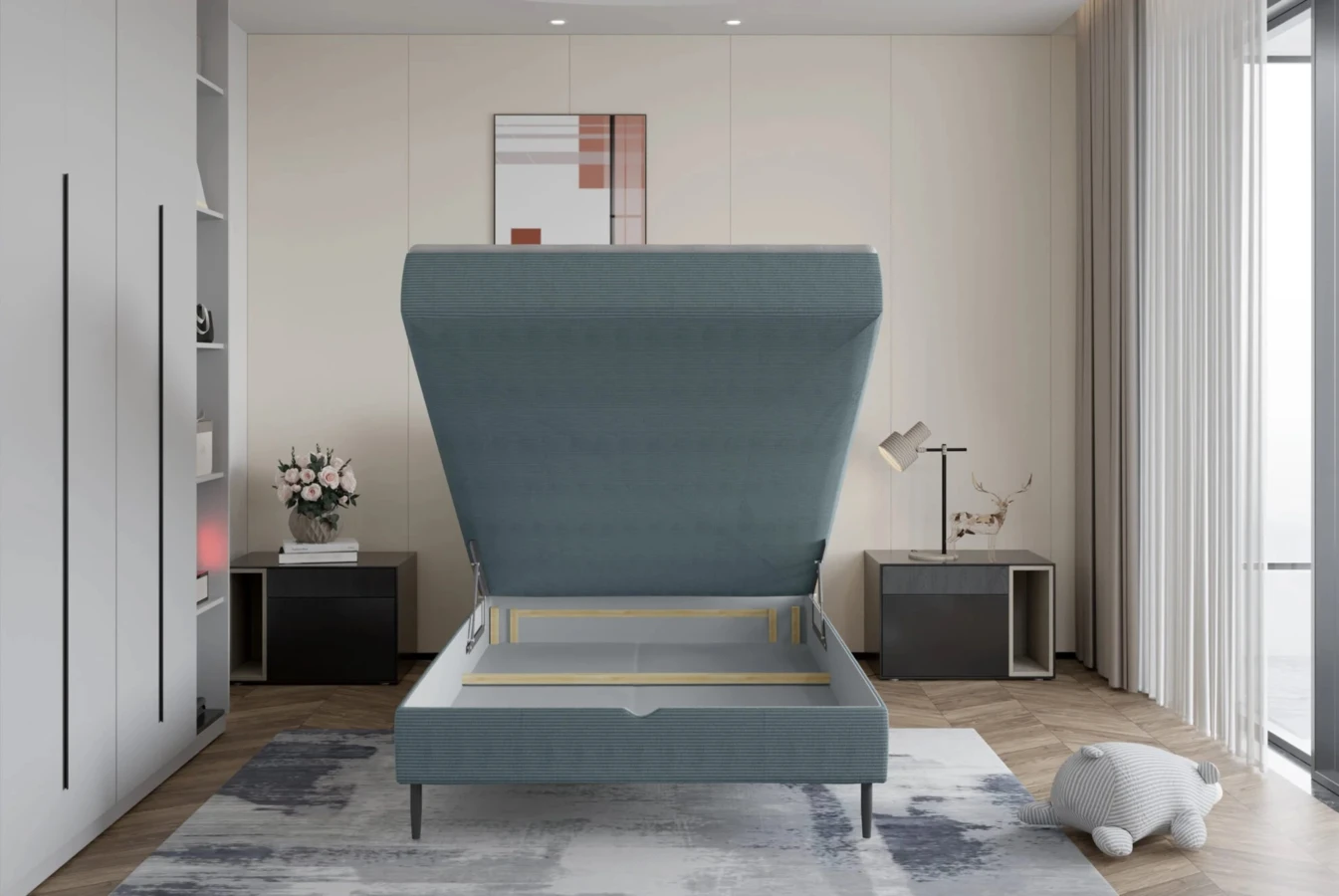 Podnoszona konstrukcja łóżka skrywa praktyczny pojemnik na pościel.