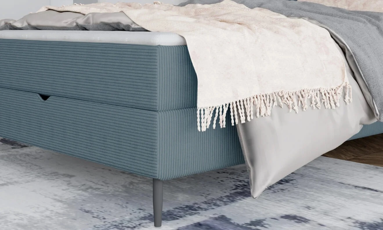 Luksusowy charakter łóżka podkreślają wysokie, czarne nóżki.