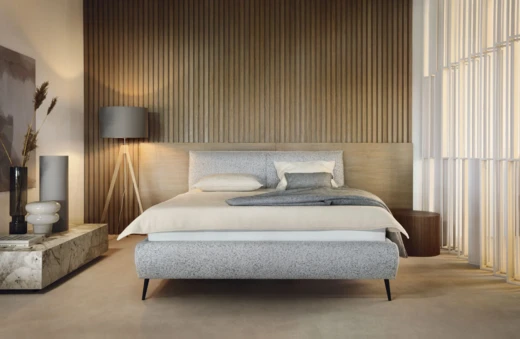 Zarówno zagłówek, jak i boki łóżka są gładkie, co podkreśla eleganckie i ponadczasowe linie całej konstrukcji.