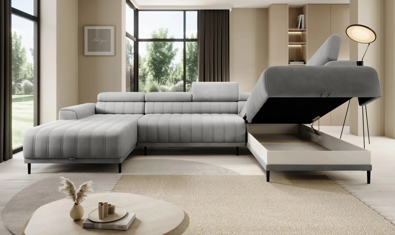 Narożnik w kształcie litery U oferuje wyjątkowy komfort dzięki połączeniu sprężyn falistych i pianki PUR.