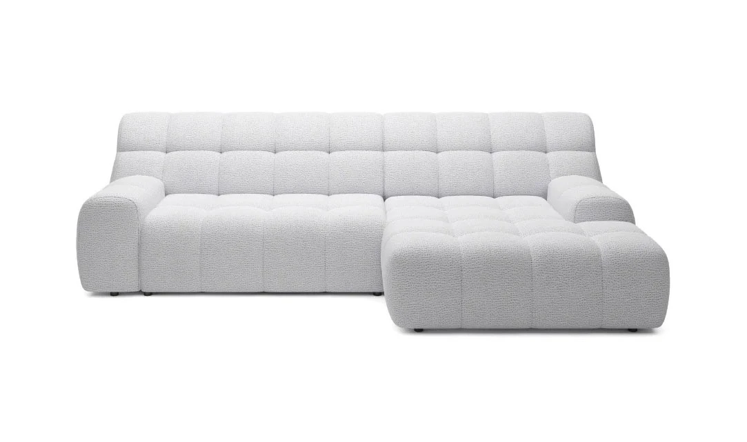 Narożnik stoi na bardzo niskich nóżkach, co zapewnia stabilność i nie zakłóca spójnego, minimalistycznego designu.