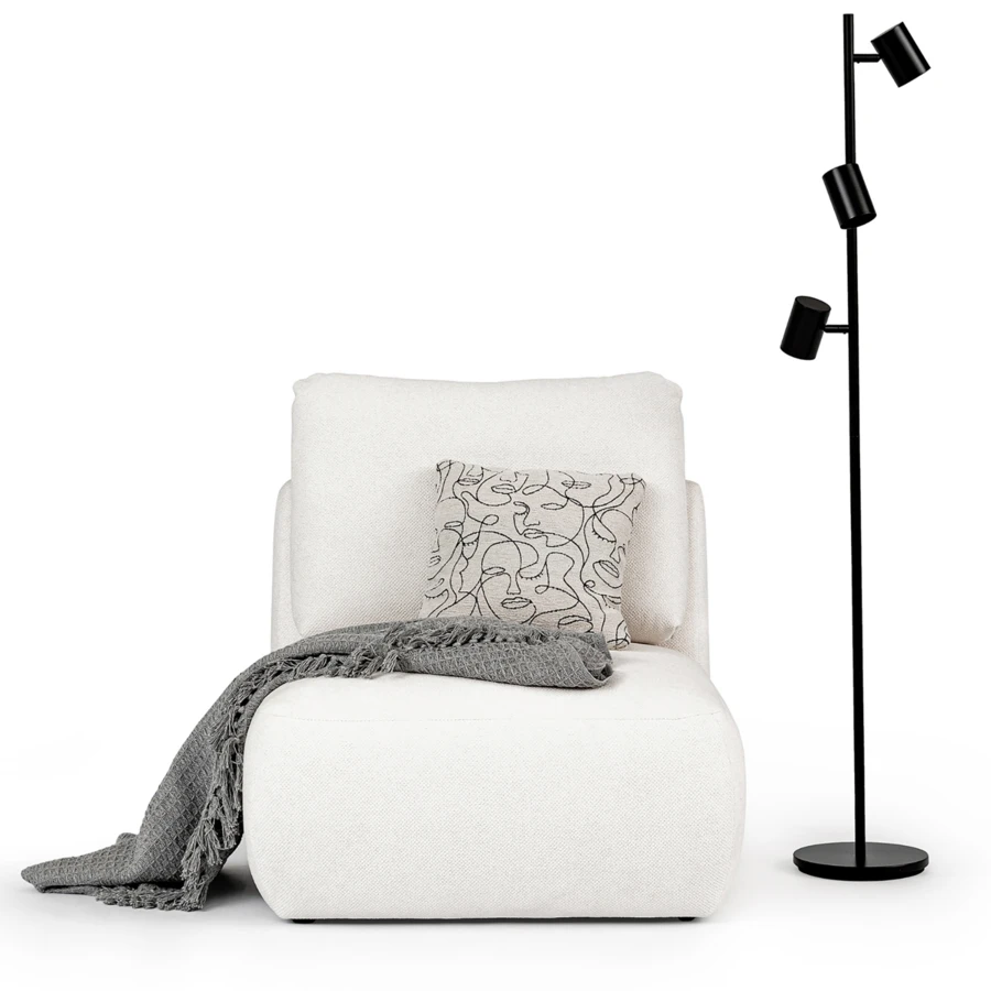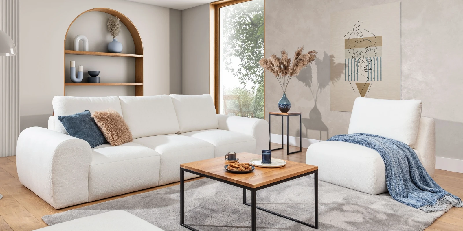 Wygodna trzyosobowa sofa z fotelem w nowoczesnym, minimalistycznym stylu.
