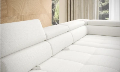 Narożnik ma tapicerowane plecy, dzięki czemu świetnie sprawdzi się również jako element ustawiony w przestrzeni.