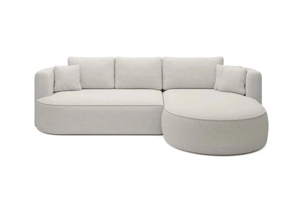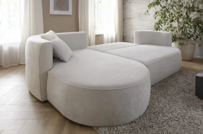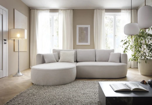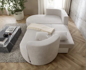 Zaokrąglone kształty sofy wyglądają bardzo przytulnie we wnętrzu i tworzą ciepłą, domową atmosferę.