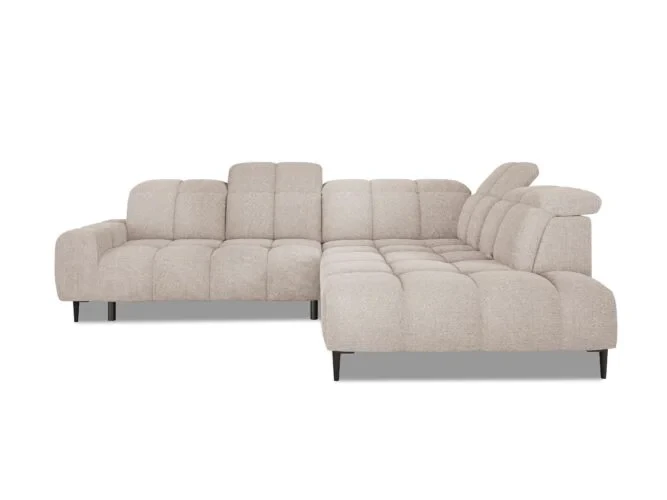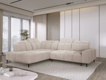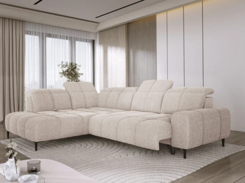 Nowoczesny narożnik z elektrycznym wysuwem i regulowanymi zagłówkami to doskonała propozycja do eleganckiego salonu. Funkcja elektrycznego wysuwu siedziska pozwala w prosty sposób powiększyć powierzchnię wypoczynkową, tworząc wyjątkowo komfortową strefę relaksu – idealną zarówno na codzienny odpoczynek, jak i wieczorny seans filmowy.