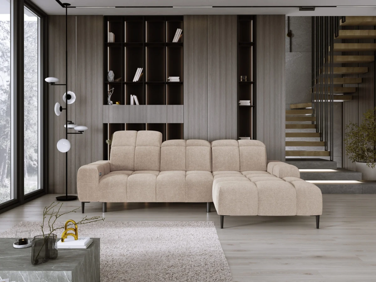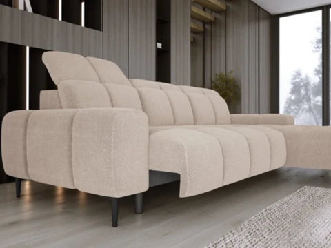 Nowoczesny narożnik z elektrycznym wysuwem i regulowanymi zagłówkami to doskonała propozycja do eleganckiego salonu. Funkcja elektrycznego wysuwu siedziska pozwala w prosty sposób powiększyć powierzchnię wypoczynkową, tworząc wyjątkowo komfortową strefę relaksu – idealną zarówno na codzienny odpoczynek, jak i wieczorny seans filmowy.
