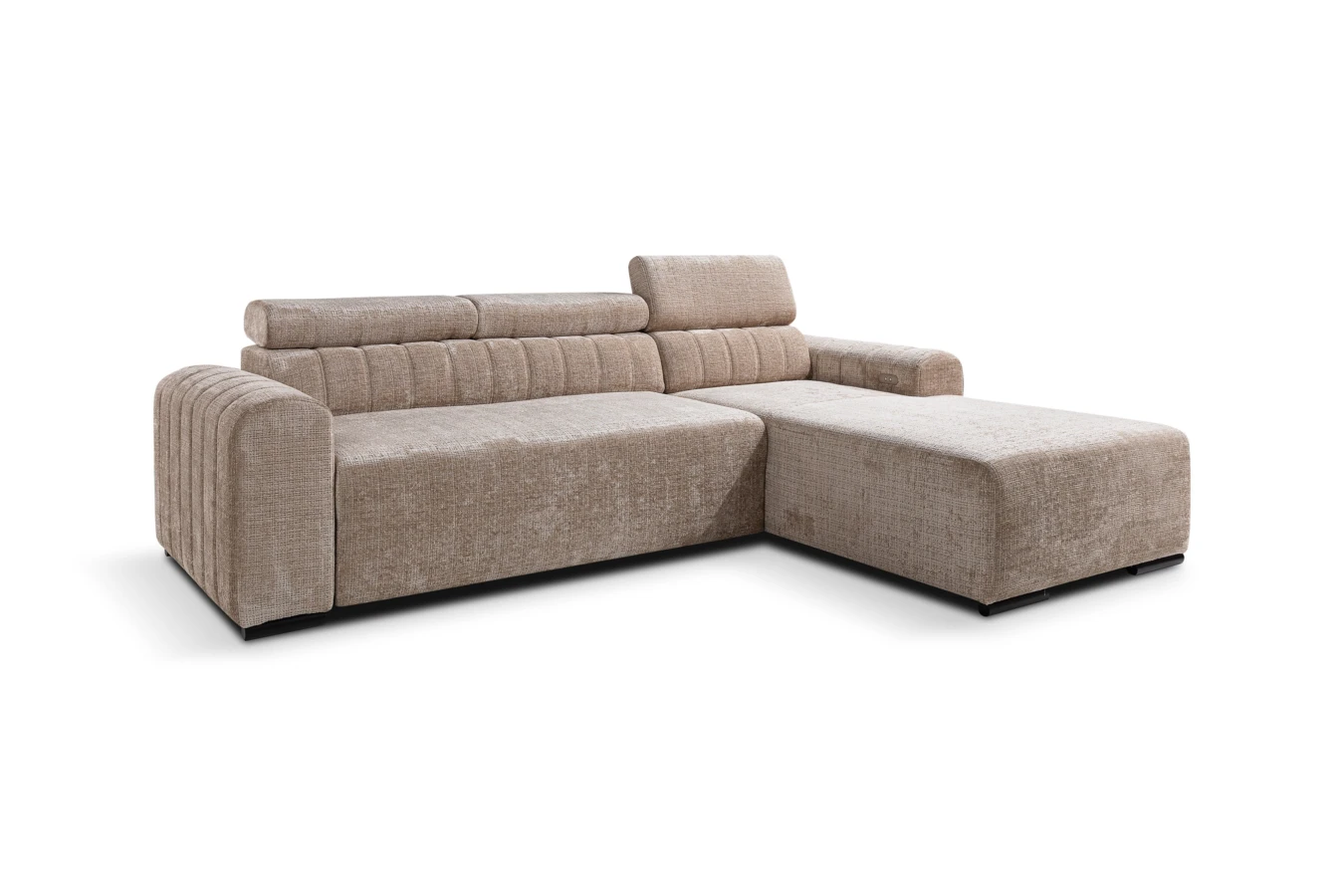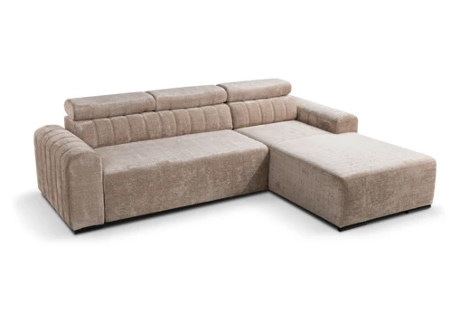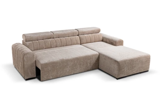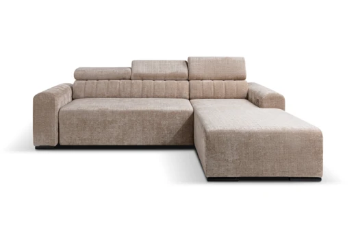 Narożnik posiada elektryczny wysuw, dzięki któremu przyciśnięciem przycisku wysuniesz środkowe siedzisko o 27 cm. Dla jeszcze większego komfortu narożnik wyposażono w regulowane zagłówki.