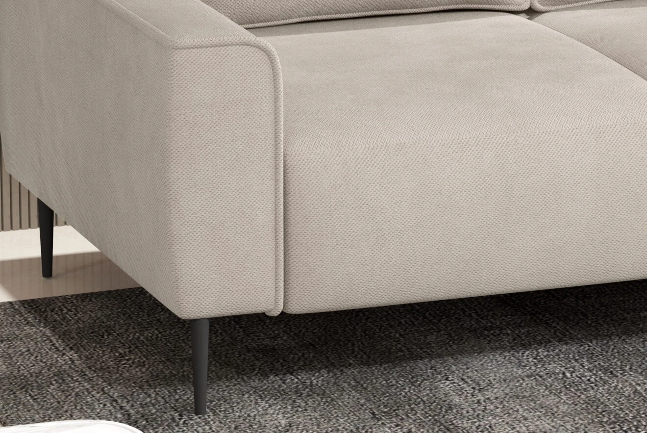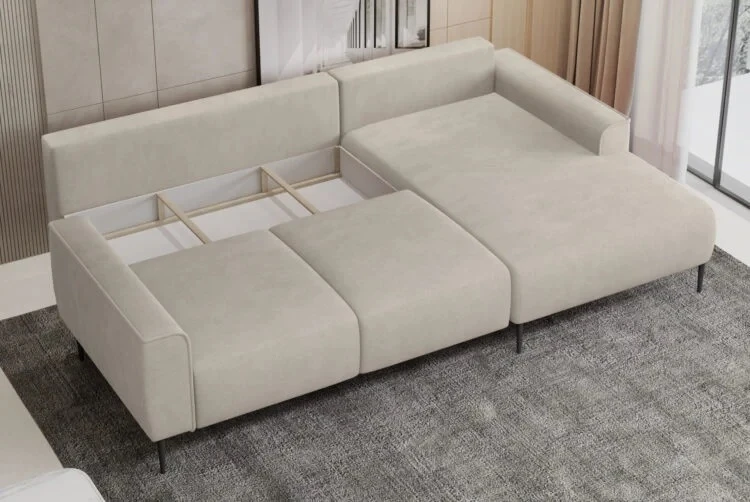 Narożna sofa składana w kształcie litery L oferuje wyjątkowy komfort dzięki połączeniu sprężyn falistych i pianki PUR.