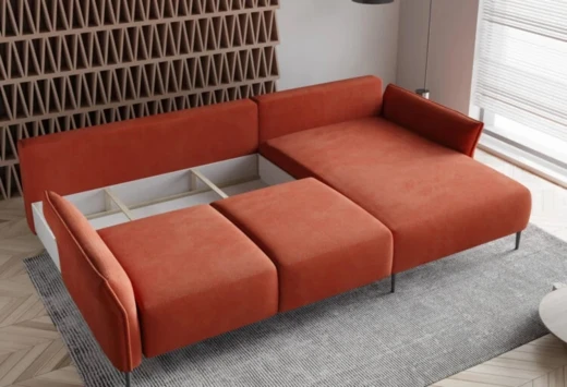 Narożna sofa składana w kształcie litery L oferuje wyjątkowy komfort dzięki połączeniu sprężyn falistych i pianki PUR .