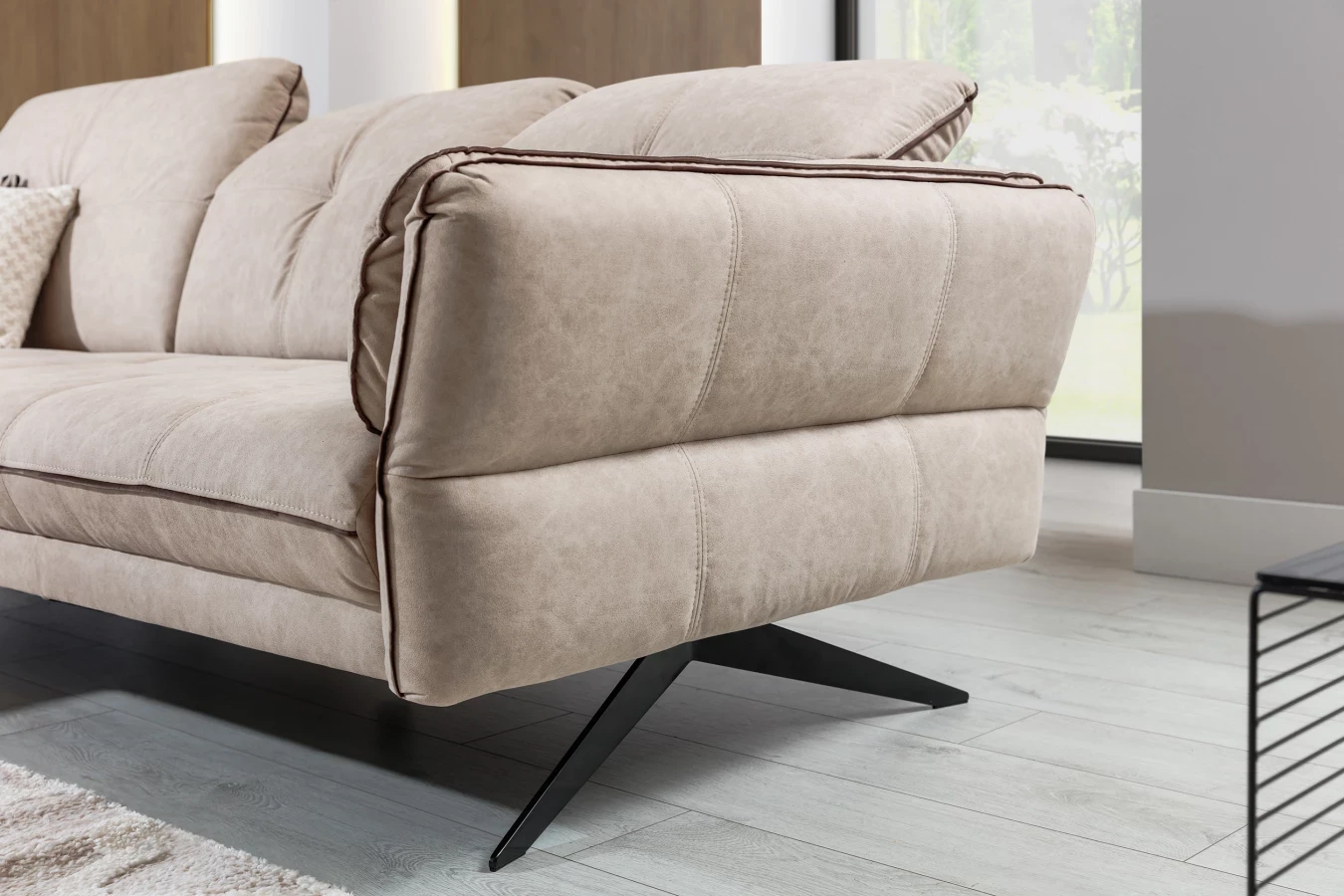 Wysokie metalowe nogi o nietypowym kształcie doskonale podkreślają nowoczesny design sofy.