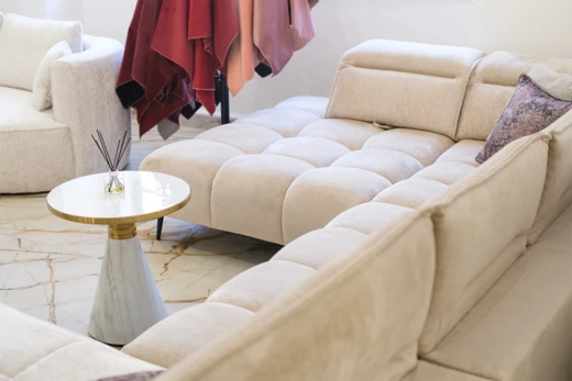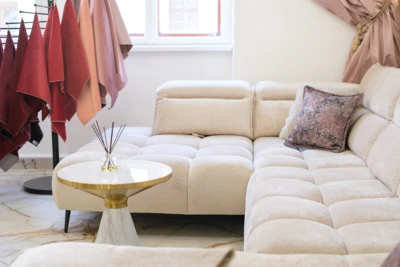 Sofa stoi na nowoczesnych metalowych nóżkach w kolorze czarnym,