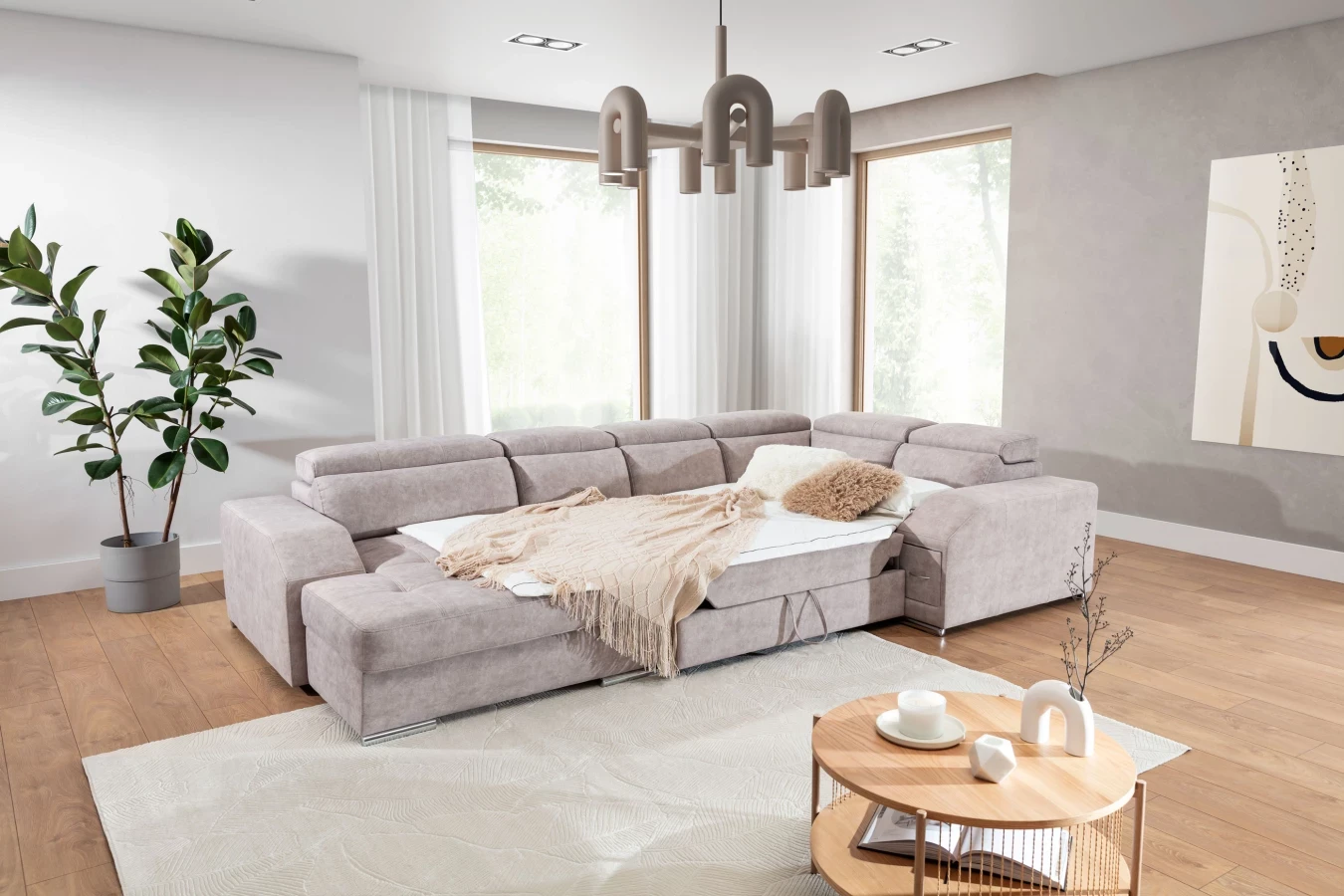 Sofa jest składana, a po rozłożeniu oferuje powierzchnię do spania o wymiarach 265x122 cm.