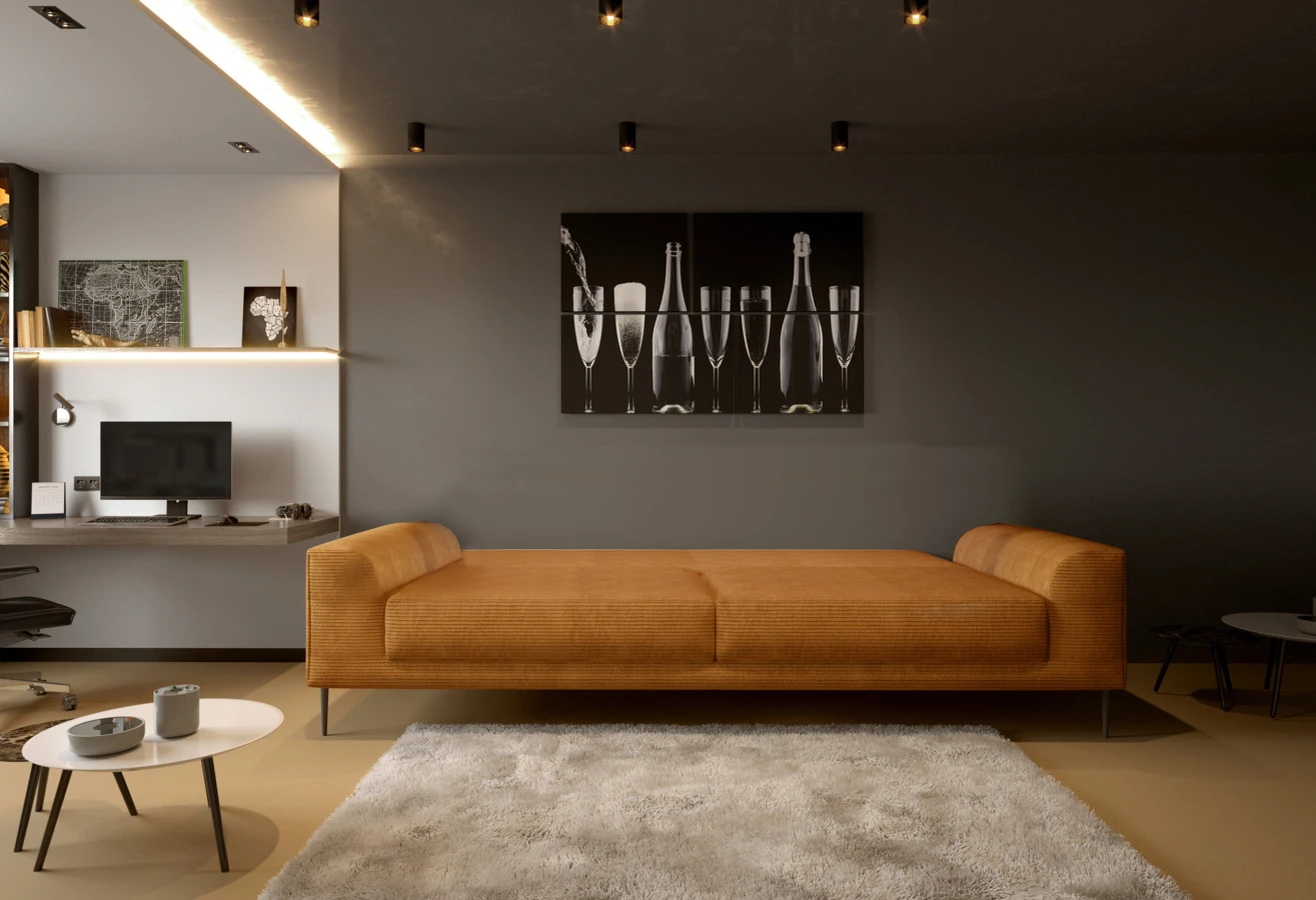 W części wypoczynkowej ukryto również praktyczną przestrzeń do przechowywania.