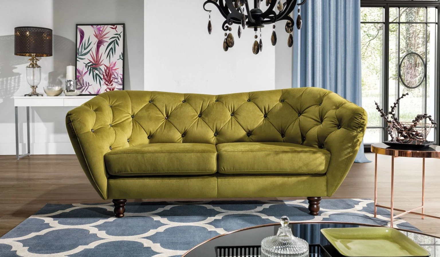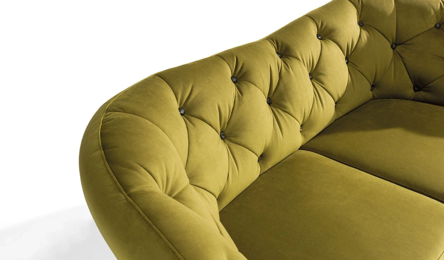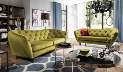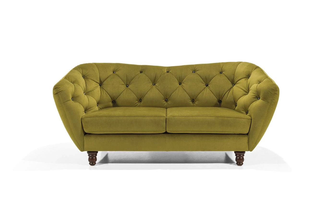 Sofa oferuje również możliwość indywidualnej personalizacji – tapicerkę można wykończyć klasycznymi guzikami w stylu chesterfield lub ozdobnymi kryształkami, które dodadzą meblowi wyjątkowego,