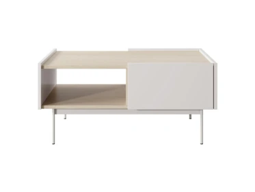 Stolik oferuje praktyczną przestrzeń do przechowywania – posiada otwartą półkę oraz funkcjonalną szufladę. Spójny wygląd podkreślają dopasowane nogi w kolorze dekoru.