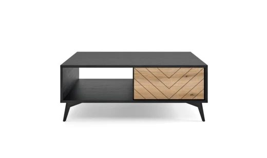 Nowoczesny stolik kawowy Diamond został wykonany z wysokiej jakości płyty laminowanej w eleganckim połączeniu czerni i dekoru dąb evoke, dzięki czemu doskonale uzupełnia aranżację nowoczesnego salonu. Materiał jest trwały i łatwy w codziennej pielęgnacji, a krawędzie zabezpieczone listwami ABS zwiększają odporność na uszkodzenia.