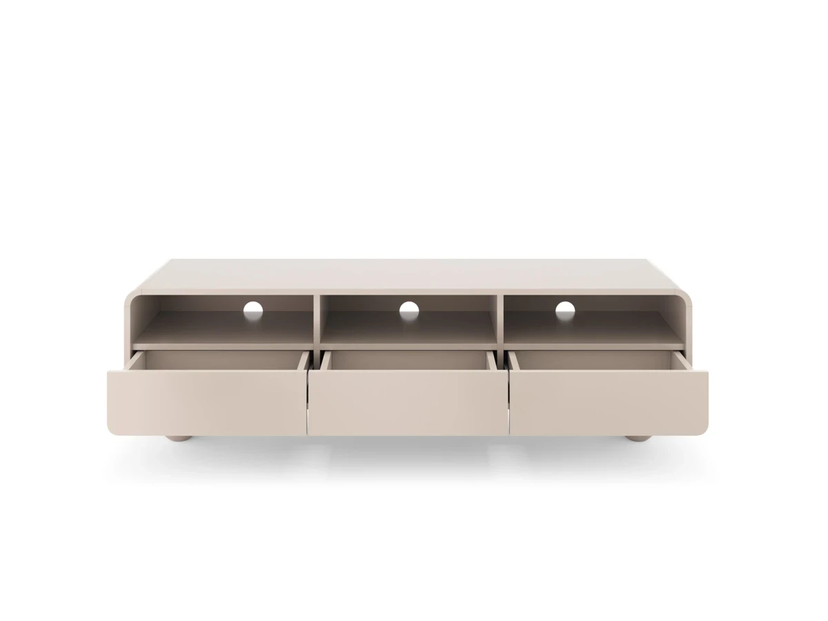 Wyjątkowy charakter mebla nadają zaokrąglone rogi i pomysłowe okrągłe nogi.