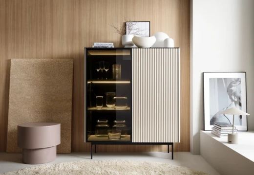 Szklana część z półkami uzupełniona jest eleganckim oświetleniem LED, które